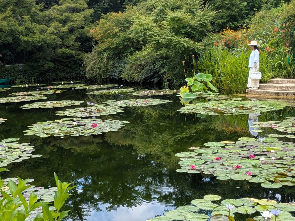 水辺に佇む女性一人。水鏡に映る木々と睡蓮。